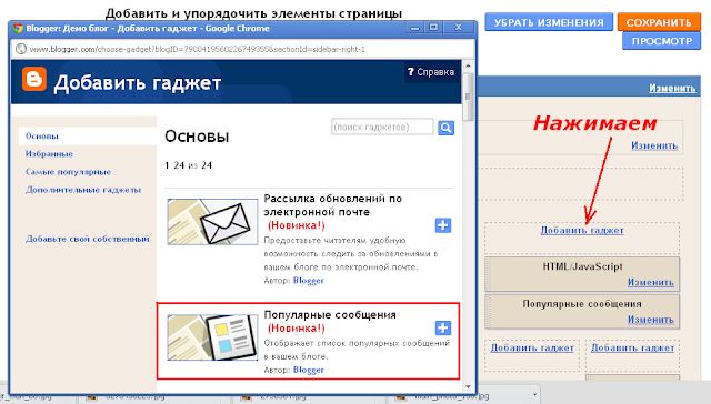 Входим в панель инструментов Blogger, нажимаем кнопку "Дизайн" затем "Элементы страницы". Нажимаем кнопку "Добавить гаджет", и в открывшейся вкладке выбираем "Популярные сообщения" и настраиваем его.